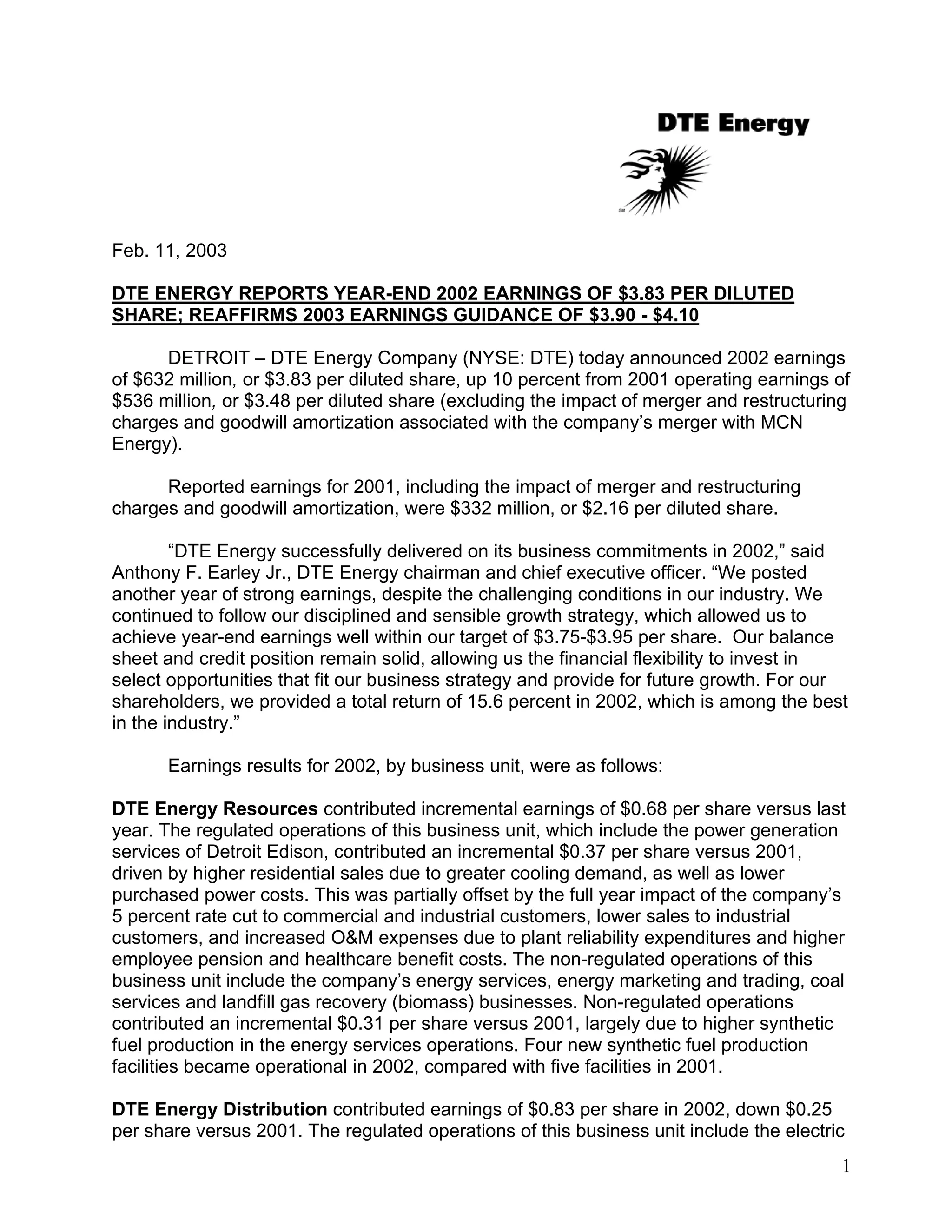 DTE Energy reported 2002 earnings of $632 million or $3.83 per diluted share, up 10% from 2001 operating earnings. Earnings for the fourth quarter of 2002 were $203 million or $1.21 per diluted share, down from 2001 operating earnings of $1.43 per diluted share. The company reaffirmed its 2003 earnings guidance of $3.90 to $4.10 per share despite anticipated challenges. By business unit, DTE Energy Resources contributed earnings growth while DTE Energy Distribution saw declines due to storm costs and DTE Energy Gas saw increases.