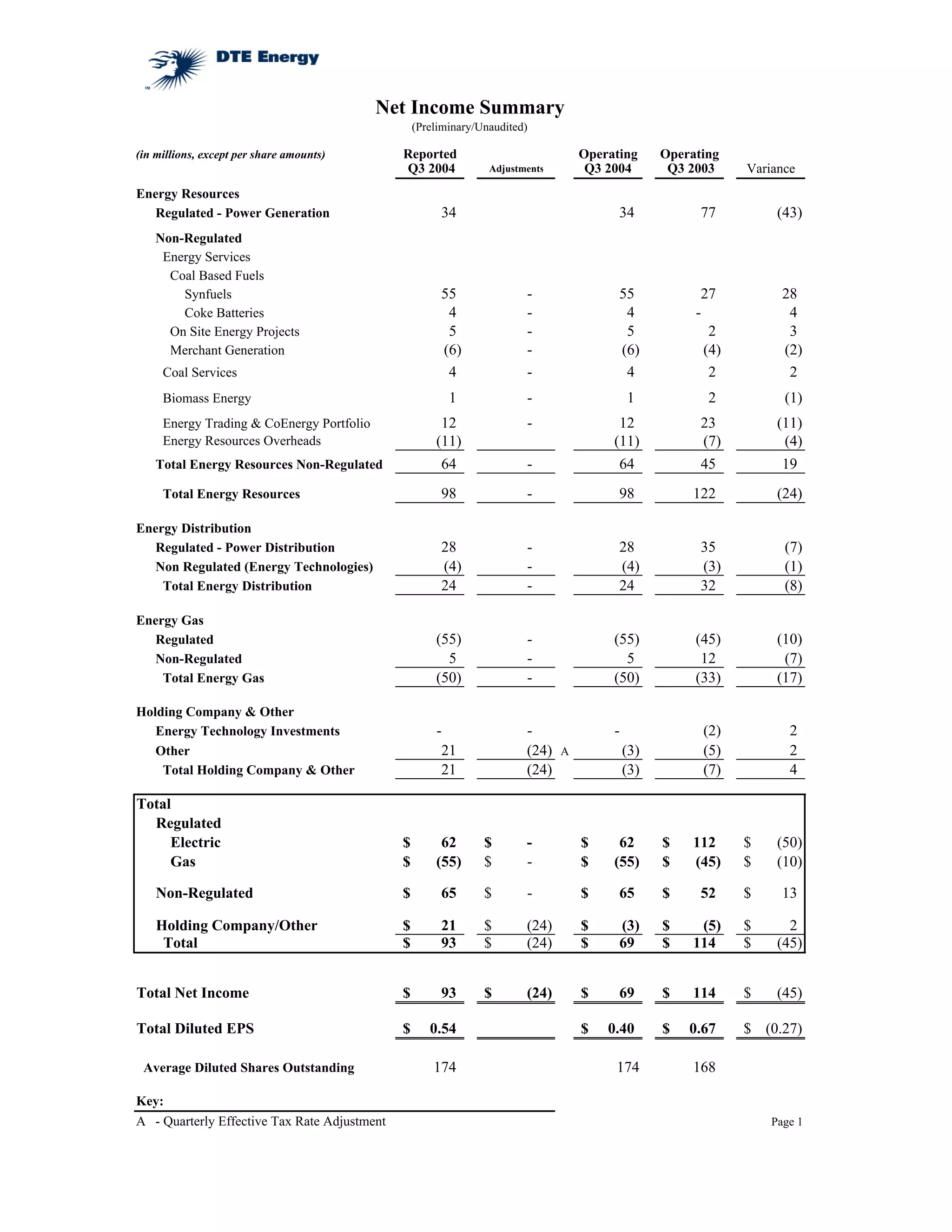 The document provides a net income summary for Q3 2004 compared to Q3 2003 for DTE Energy Company and its subsidiaries. Key highlights include: - Total net income was $69 million in Q3 2004 compared to $114 million in Q3 2003, a decrease of $45 million. - Earnings per share decreased from $0.67 in Q3 2003 to $0.40 in Q3 2004, a decrease of $0.27 per share. - Lower earnings in regulated electric power generation and energy gas were partially offset by higher earnings from non-regulated energy services and energy distribution.