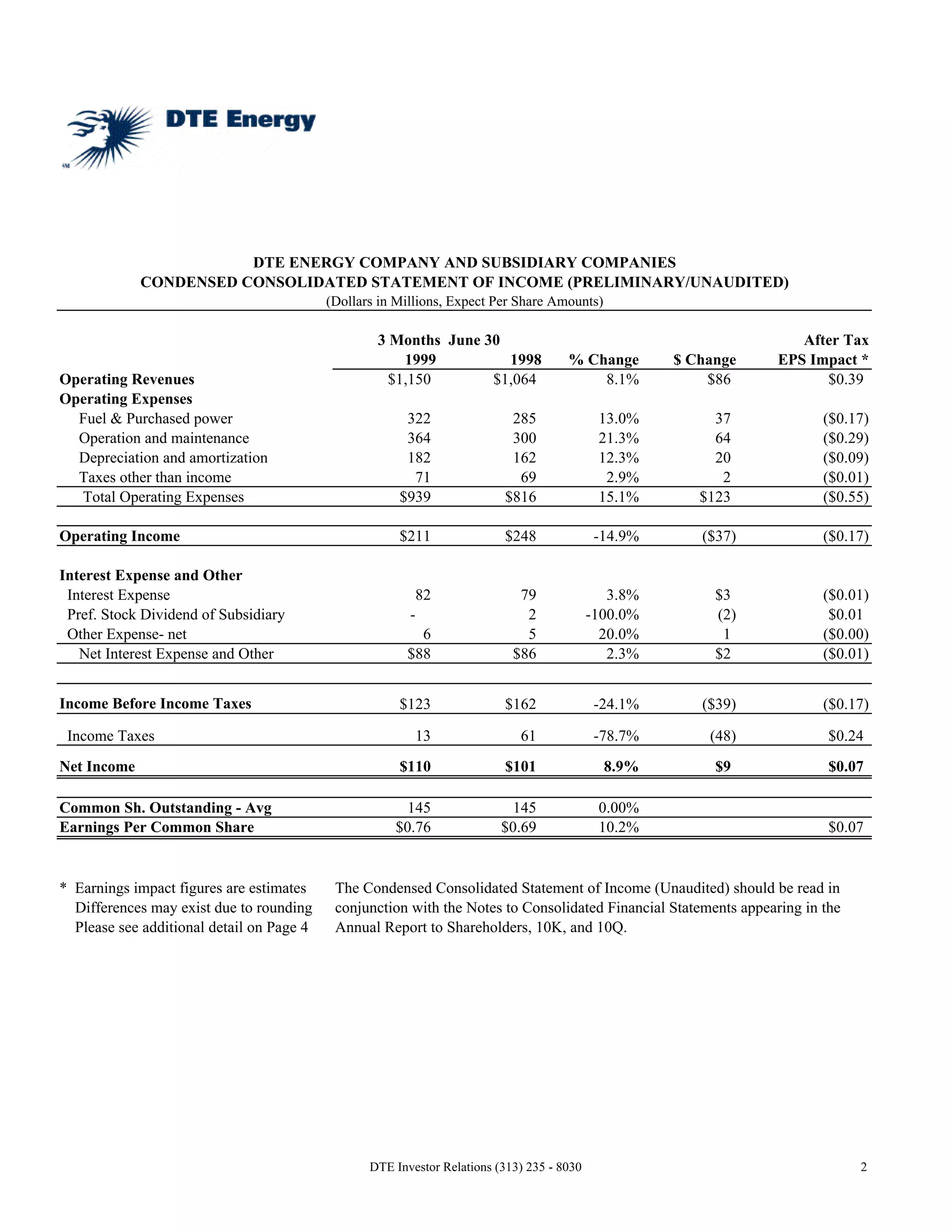 DTE Energy reported financial results for the second quarter and first six months of 1999. Operating revenues increased 8.1% and 8.2% respectively compared to the same periods in 1998. However, higher operating expenses led to a decrease in operating income of 14.9% and 11.4%. Net income increased by 8.9% and 9.8% due to lower income tax expenses. Cash used for investing activities increased as the company spent more on plant and equipment expenditures.