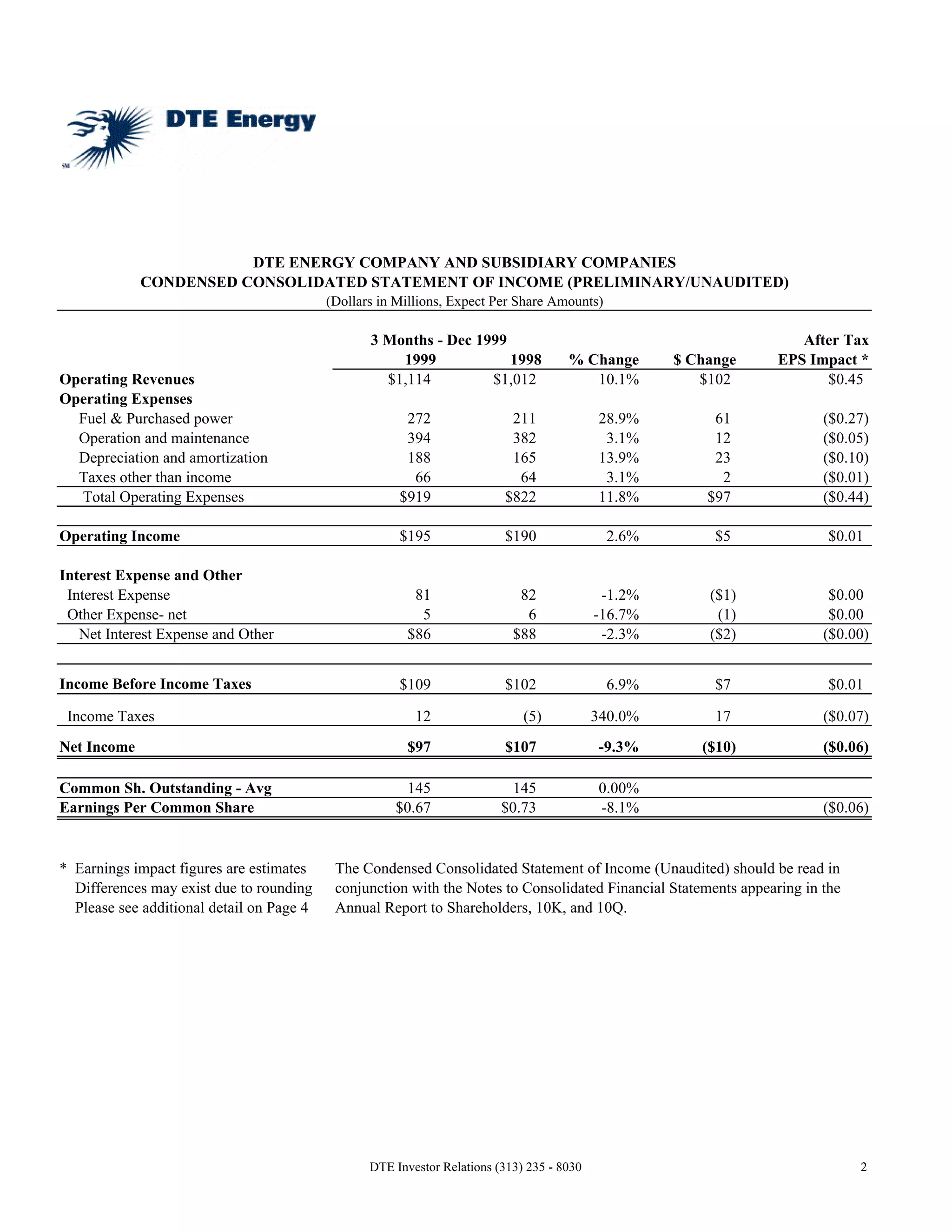 DTE Energy reported financial results for the fourth quarter and full year 1999. For the quarter, operating revenues increased 10.1% to $1.1 billion but net income decreased 9.3% to $97 million due to higher fuel and operating costs. For the full year, operating revenues rose 12.0% to $4.7 billion while net income grew 9.0% to $483 million due to increased industrial sales and non-regulated business income, partially offset by higher fuel expenses. Cash from operating activities totaled $1.1 billion for 1999.