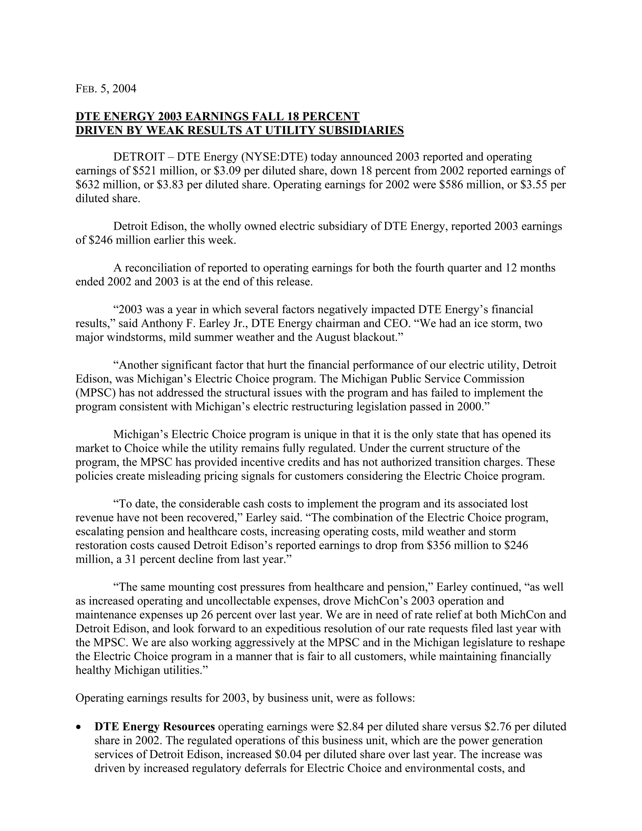 DTE Energy reported earnings for 2003 fell 18% from 2002, driven by weak results at its utility subsidiaries, Detroit Edison and MichCon. Earnings at Detroit Edison dropped 31% due to impacts of Michigan's Electric Choice program, as well as higher costs and mild weather. MichCon saw a 26% rise in operating expenses. The CEO noted regulatory issues need resolution and Electric Choice program flaws addressed for financial health of the utilities. Non-regulated operations increased earnings 7% and continued stable growth, but regulated businesses face financial pressure until regulatory issues are resolved.