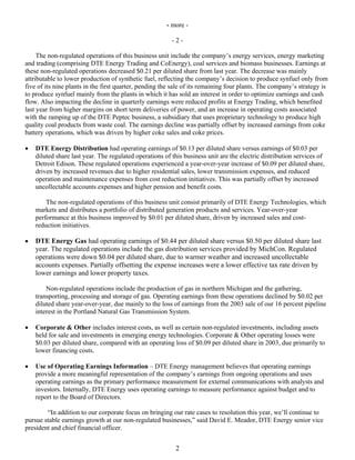 DTE Energy reported earnings of $186 million for the first quarter of 2004, up from $155 million in the first quarter of 2003. Operating earnings, which exclude non-recurring items, were $151 million, comparable to the $178 million reported in the first quarter of 2003. Earnings were impacted by warmer weather and increased uncollectable accounts at the company's gas distribution business. The company expects to receive rate relief in 2004 that will help improve earnings performance for the year.