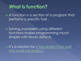 This document discusses functions in C programming. It defines a function as a section of code that performs a specific task. Functions make programming simpler by splitting problems into smaller, more manageable sub-problems. The key advantages are that problems can be viewed at a smaller scope, program development is faster, and programs are easier to maintain. There are two types of functions - library functions provided by the language and user-defined functions written by the programmer. Functions can take parameters, perform operations, and return values. Well-structured functions are important for organizing code and solving complex problems.