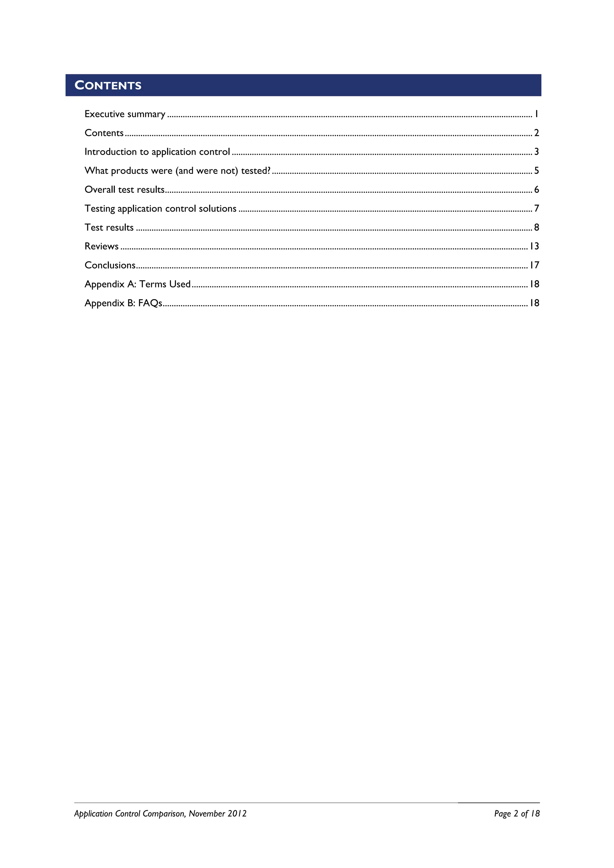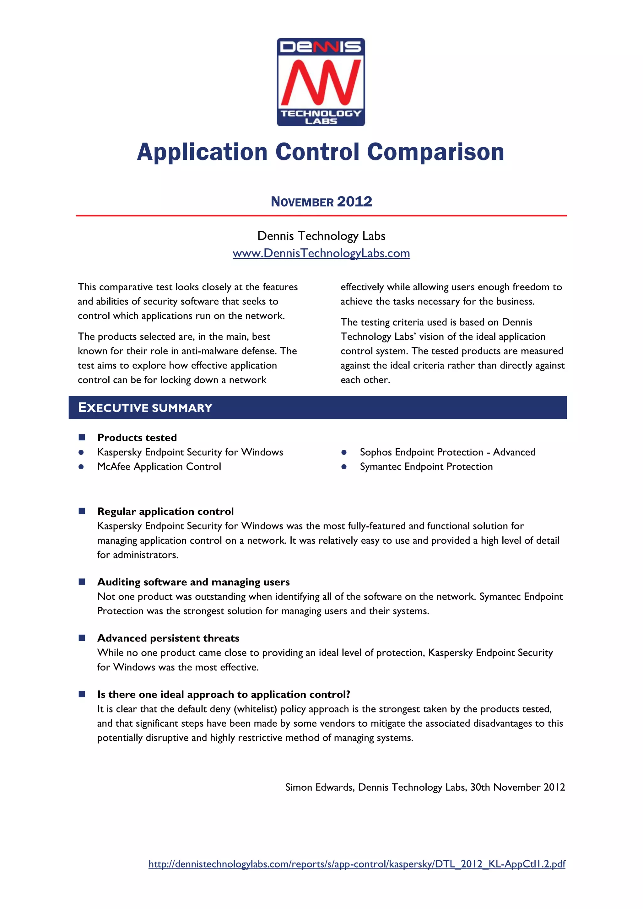 This document compares application control software from four vendors: Kaspersky Endpoint Security for Windows, McAfee Application Control, Sophos Endpoint Protection - Advanced, and Symantec Endpoint Protection. It evaluates their abilities to regularly control applications, audit installed software, protect against advanced persistent threats, and manage users. The testing found that Kaspersky provided the most fully-featured application control and was most effective against threats. While no product was perfect, default deny policies that whitelist approved applications were deemed the strongest approach to application control.