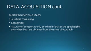This document is a thesis submitted by Gagandeep Singh for his M.Tech degree in RS & GIS from NIT Warangal in 2013-2015. It discusses various topics related to digital terrain modeling including contour lines, grid DTMs, TINs, the differences between DSMs and DEMs, data acquisition methods, processing techniques, and applications of digital terrain data. It also evaluates different data sources for terrain modeling like SRTM, topographic maps, and Google Earth imagery and assesses their accuracy through statistical analysis and visual inspection.