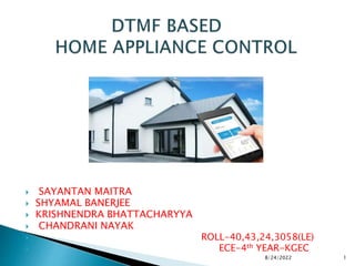 The document outlines a minor project titled 'DTMF Based Home Appliance Control,' developed by students at Kanyapur Government Engineering College as part of their B.Tech studies. The project aims to automate home appliance control using Dual Tone Multi Frequency (DTMF) technology, enabling remote operation for convenience and security. It includes technical details about components, circuit designs, and practical applications, emphasizing cost-effectiveness and energy savings.