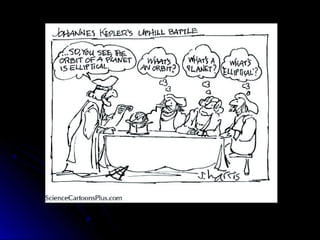 This chapter discusses the scientific discoveries that revealed the Earth is not at the center of the universe, including Copernicus's argument that planets orbit the Sun. It describes how Kepler determined planetary orbits depend on Tycho Brahe's observations, and how Newton formulated the law of gravity to explain why planets remain in orbit. The scientific method is used to develop theories through observation, hypothesis, prediction, testing, modification and simplification.