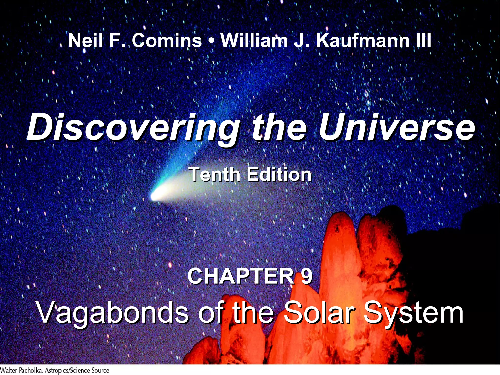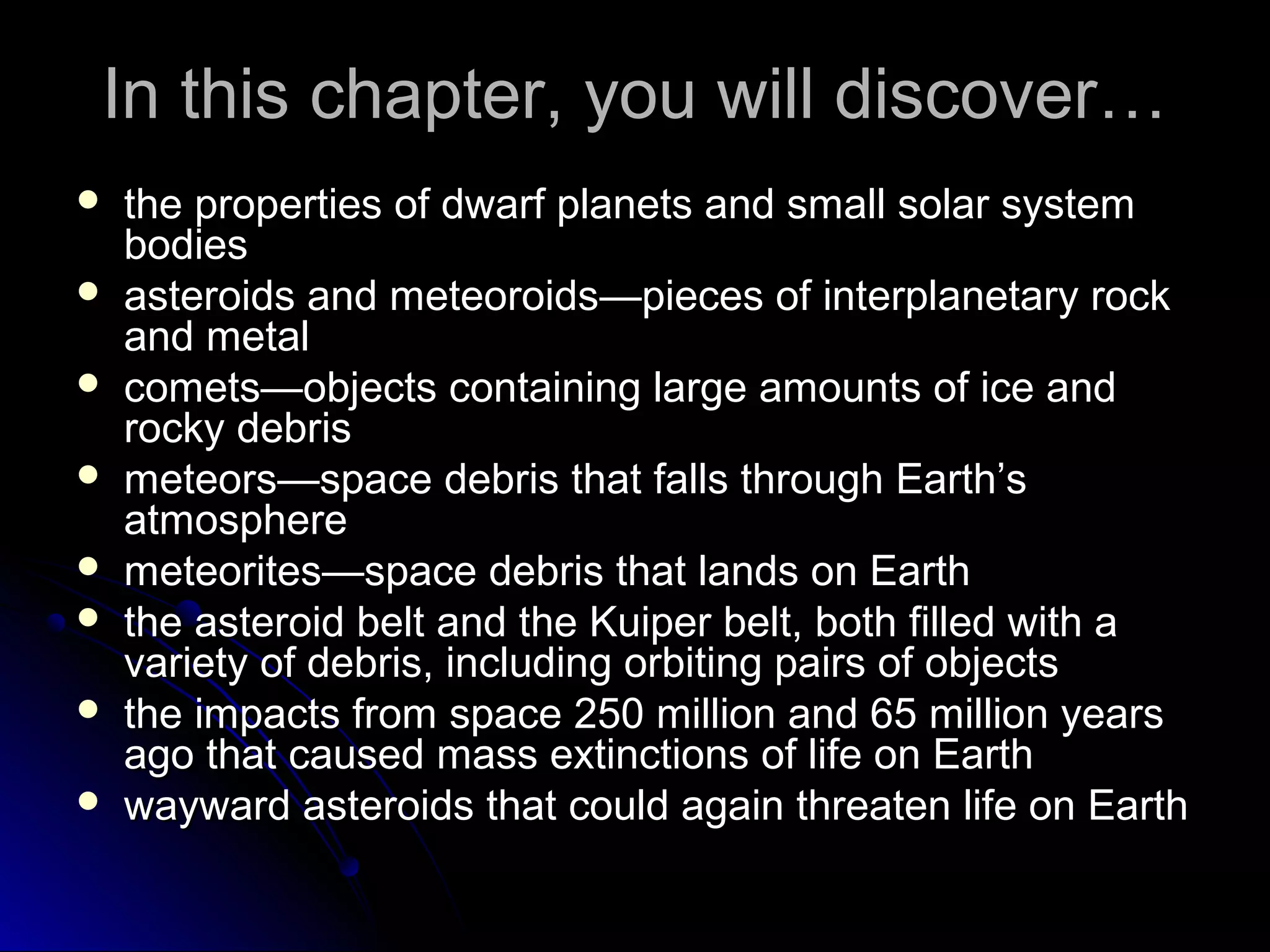 This chapter discusses small solar system bodies like dwarf planets, asteroids, meteoroids, comets, and Kuiper Belt objects. It describes their properties and classifications. Key points include that dwarf planets like Pluto and Eris have been discovered in the outer solar system, along with their moons. Asteroids exist in the main belt between Mars and Jupiter and some have orbits that cross Earth's. Comets contain ice and debris and have tails when close to the Sun. Impacts from these small bodies have caused mass extinctions on Earth in the past.