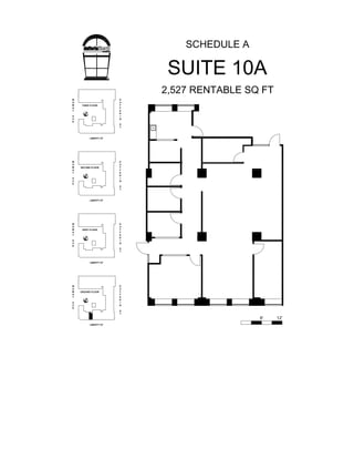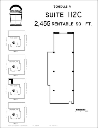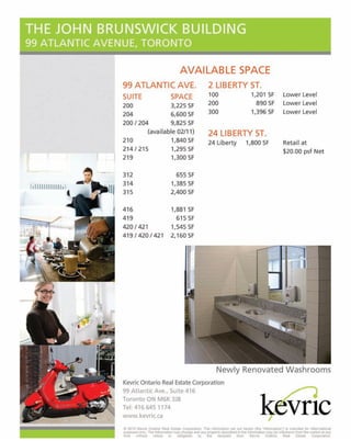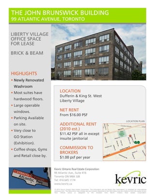 The document details various commercial real estate properties for lease in Toronto, outlining their specifics such as floor area, net rent, additional rent, and tenant improvement allowances. It includes contact information for relevant representatives and emphasizes the need for potential tenants to verify the accuracy of the provided information. The properties mentioned highlight features like brick and beam construction and modern office amenities, appealing to businesses seeking creative workspaces.