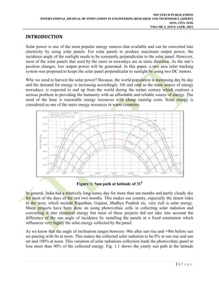 The document discusses the design and construction of a dual-axis solar tracking system aimed at maximizing solar energy capture by keeping photovoltaic panels aligned with sunlight. It highlights how this system improves energy output compared to fixed and single-axis trackers, achieving significant increases in power generation. Experimental results show that dual-axis tracking can enhance energy capture by approximately 40%, emphasizing the need for sustainable energy solutions in light of growing global energy demands.