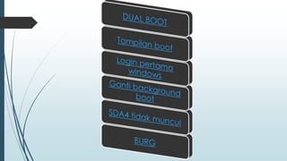 Dokumen ini menjelaskan langkah-langkah untuk menginstal sistem operasi dual boot Windows 7 dan Kubuntu, mulai dari persiapan, instalasi, hingga konfigurasi tampilan boot. Terdapat instruksi rinci mengenai pembagian partisi dan cara mengatur prioritas sistem operasi yang pertama kali dimuat. Selain itu, dijelaskan cara mengganti tampilan latar belakang boot screen menggunakan gambar pilihan.