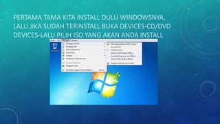 Dokumen ini memberikan instruksi langkah demi langkah untuk melakukan instalasi dual boot Windows 7 dan Ubuntu 13.10 pada sebuah komputer. Langkah-langkahnya meliputi instalasi terlebih dahulu Windows 7, memasang ISO Ubuntu, memilih partisi manual saat instalasi Ubuntu, mengatur grub configuration file untuk menampilkan menu dual boot yang rapi.