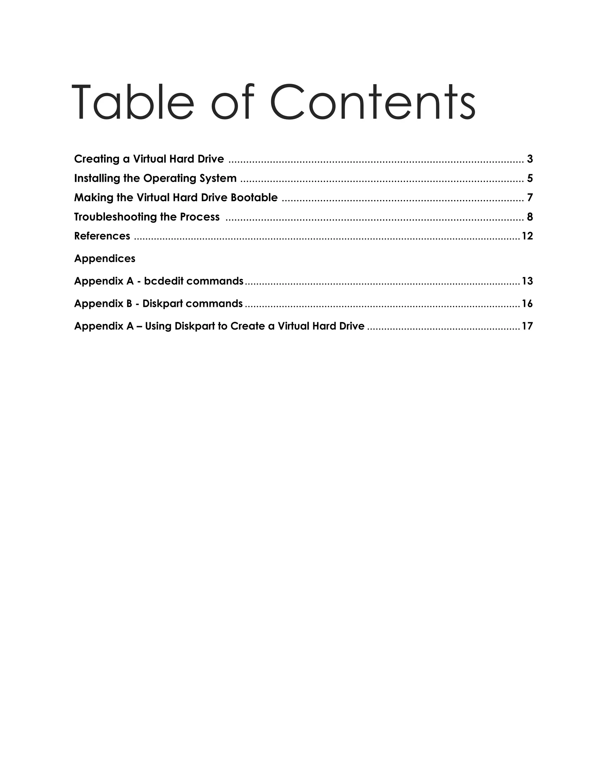 The document discusses how to create a virtual hard drive (VHD) and install an operating system on it to enable dual booting. It describes using Disk Management or Diskpart to create a VHD, installing an OS using Windows AIK, and making the VHD bootable using bcdedit commands. Troubleshooting tips are provided for issues encountered like the OS not booting from the VHD and ensuring the correct device and osdevice settings in the BCD file. Appendices provide details on bcdedit and Diskpart commands.