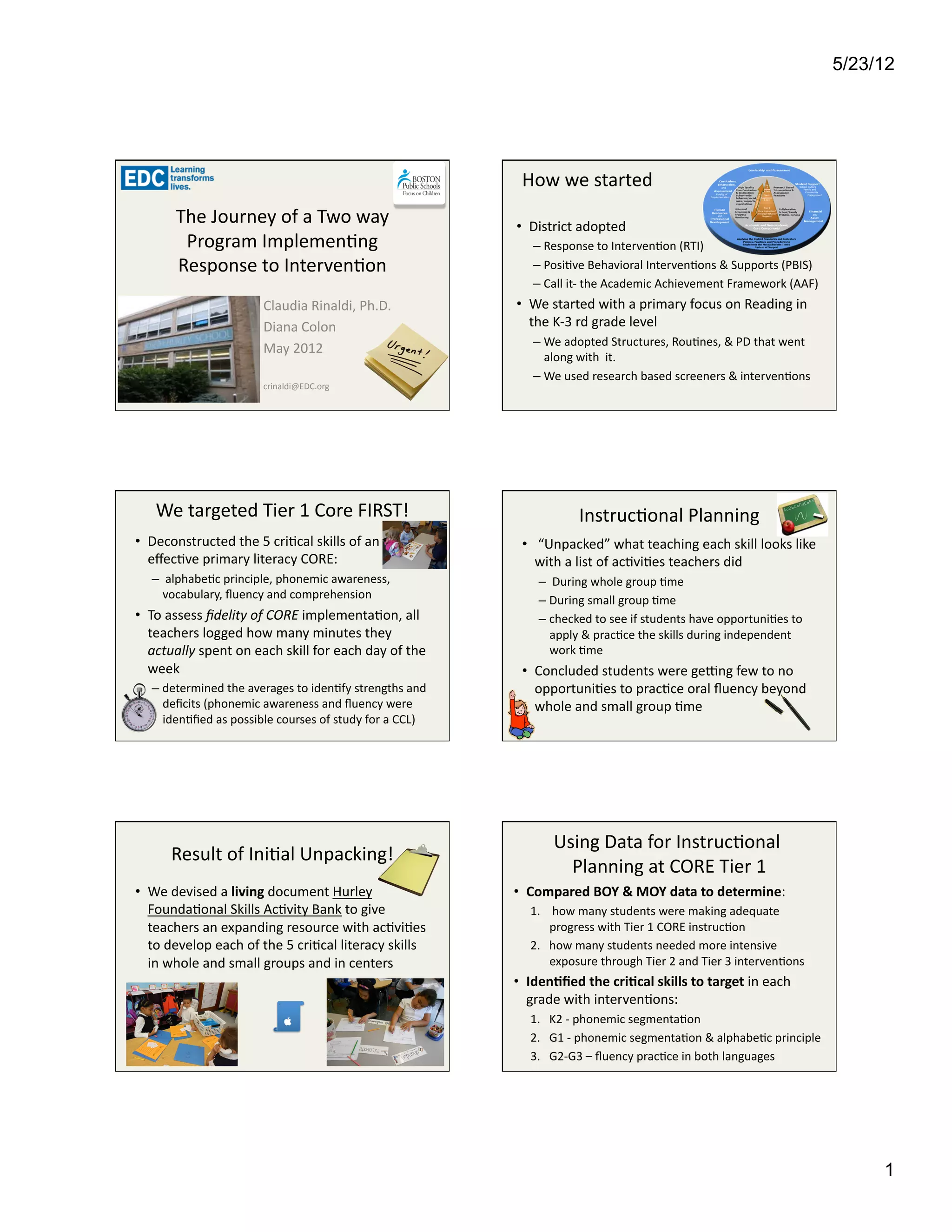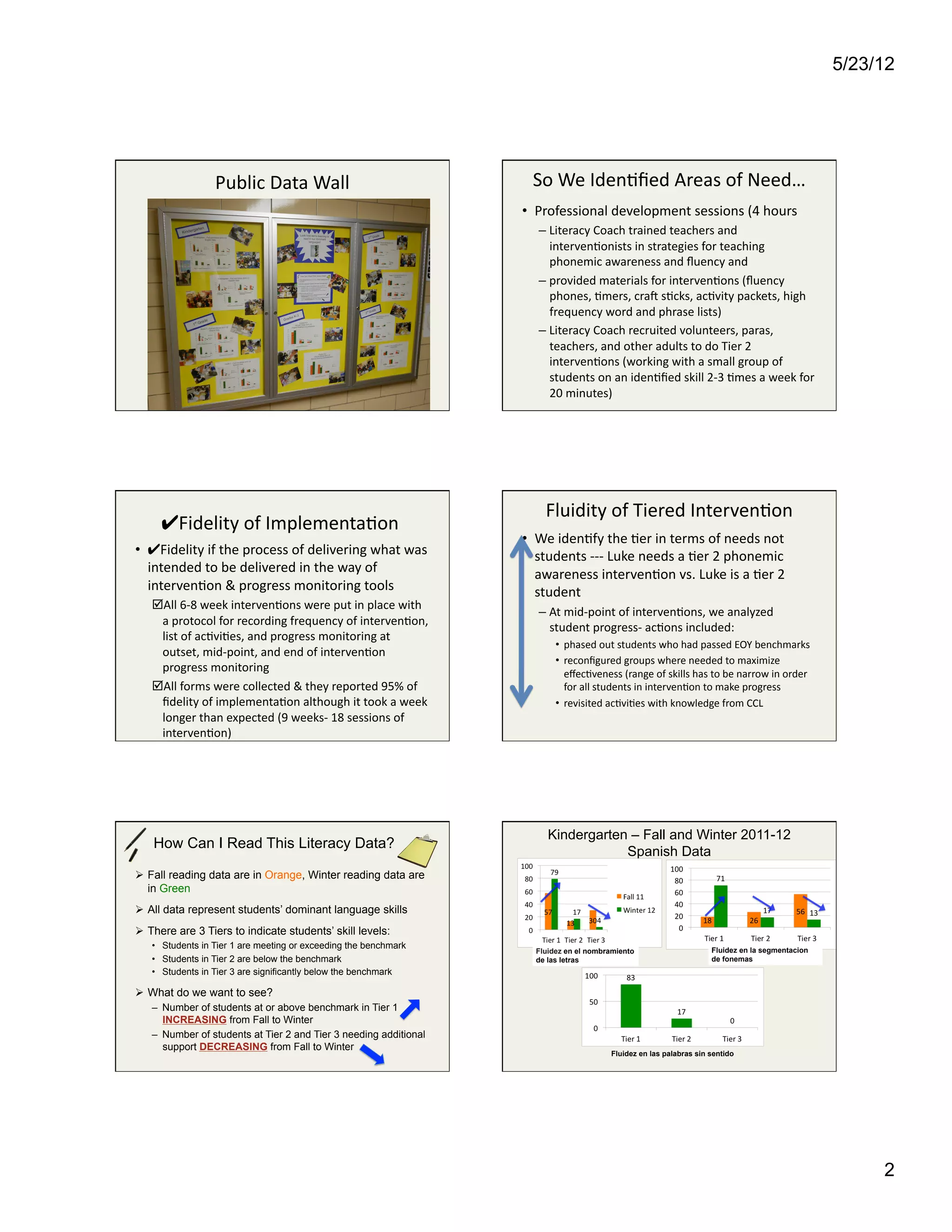 The document outlines the implementation of a two-way intervention program focusing on literacy, specifically in K-3 education, utilizing research-based strategies and tools. It involves targeting critical literacy skills, assessing student progress, and using data to drive instructional planning and intervention effectiveness. Various strategies, including professional development and the PALS peer-assisted learning system, were introduced to improve reading fluency and comprehension among students.
