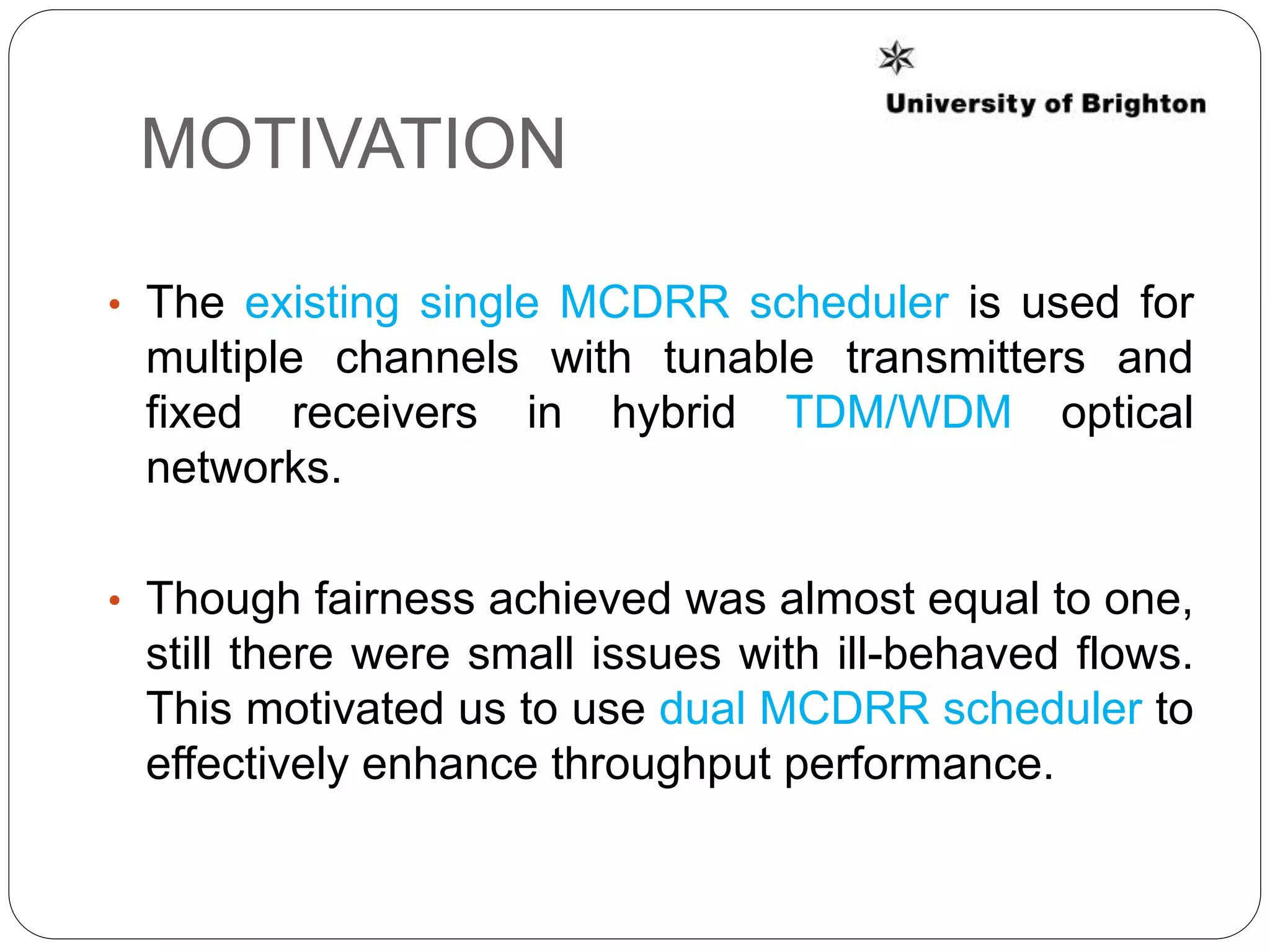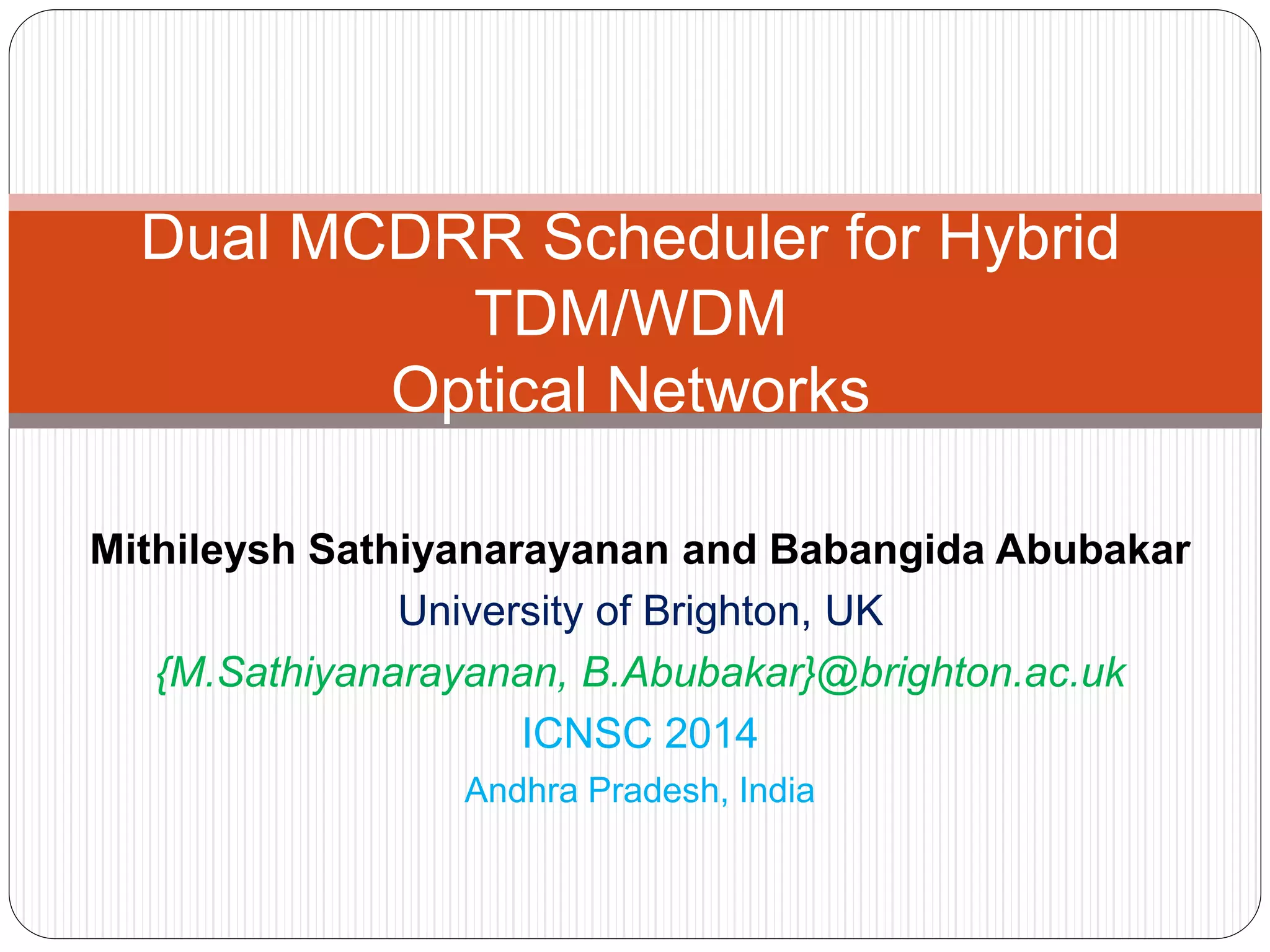 The document proposes a dual multi-channel deficit round-robin (D-MCDRR) scheduler for hybrid TDM/WDM optical networks. The existing single MCDRR scheduler has small issues with ill-behaved flows. The D-MCDRR scheduler uses two MCDRR schedulers to better utilize network resources like channels and transmitters. Simulation results show the D-MCDRR scheduler provides better throughput than the single MCDRR scheduler. Future work includes more simulation results considering delay and latency, and establishing mathematical bounds for fairness and latency.