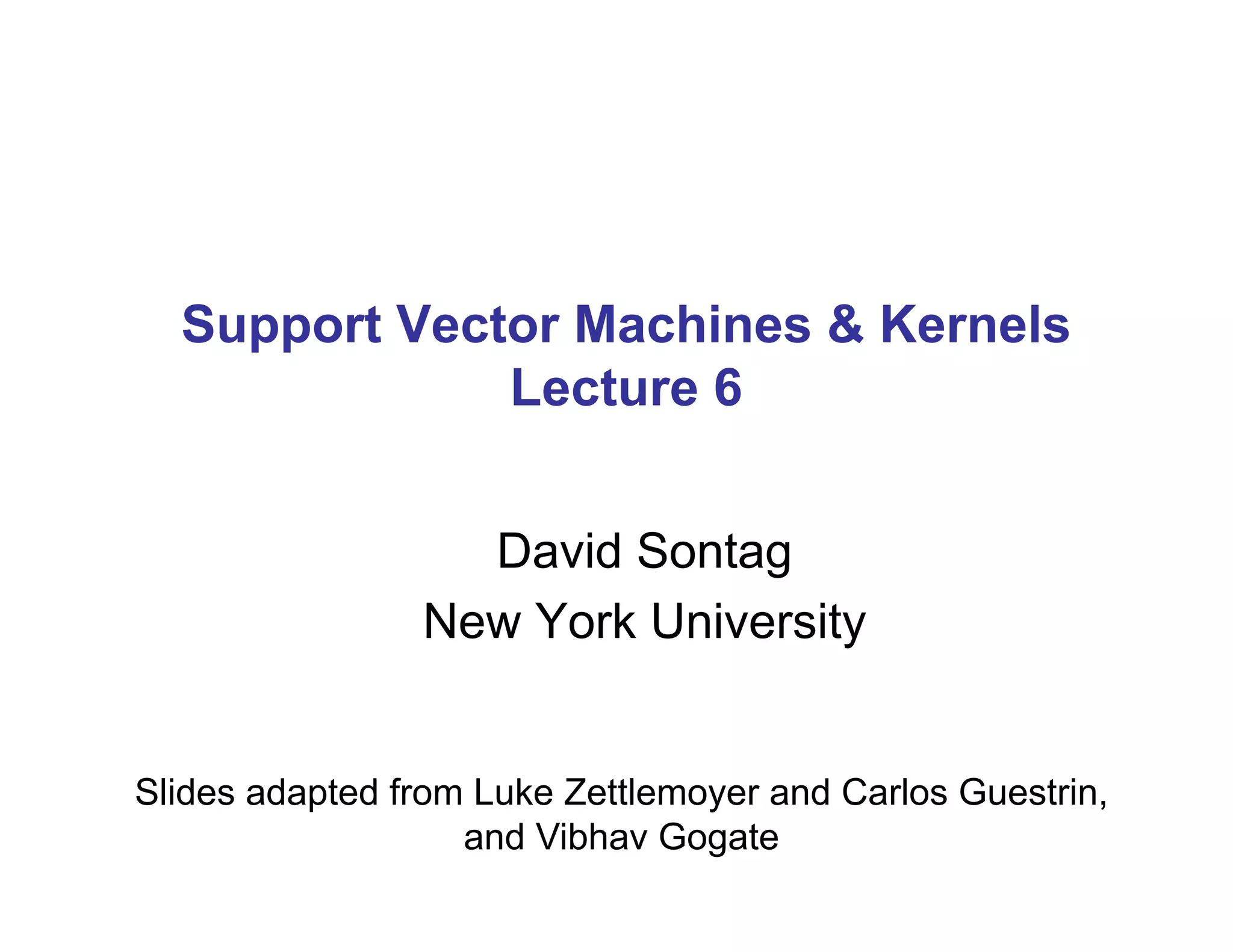 1) The document discusses support vector machines and kernels. It covers the derivation of the dual formulation of SVMs, which allows solving directly for the α values rather than w and b.
