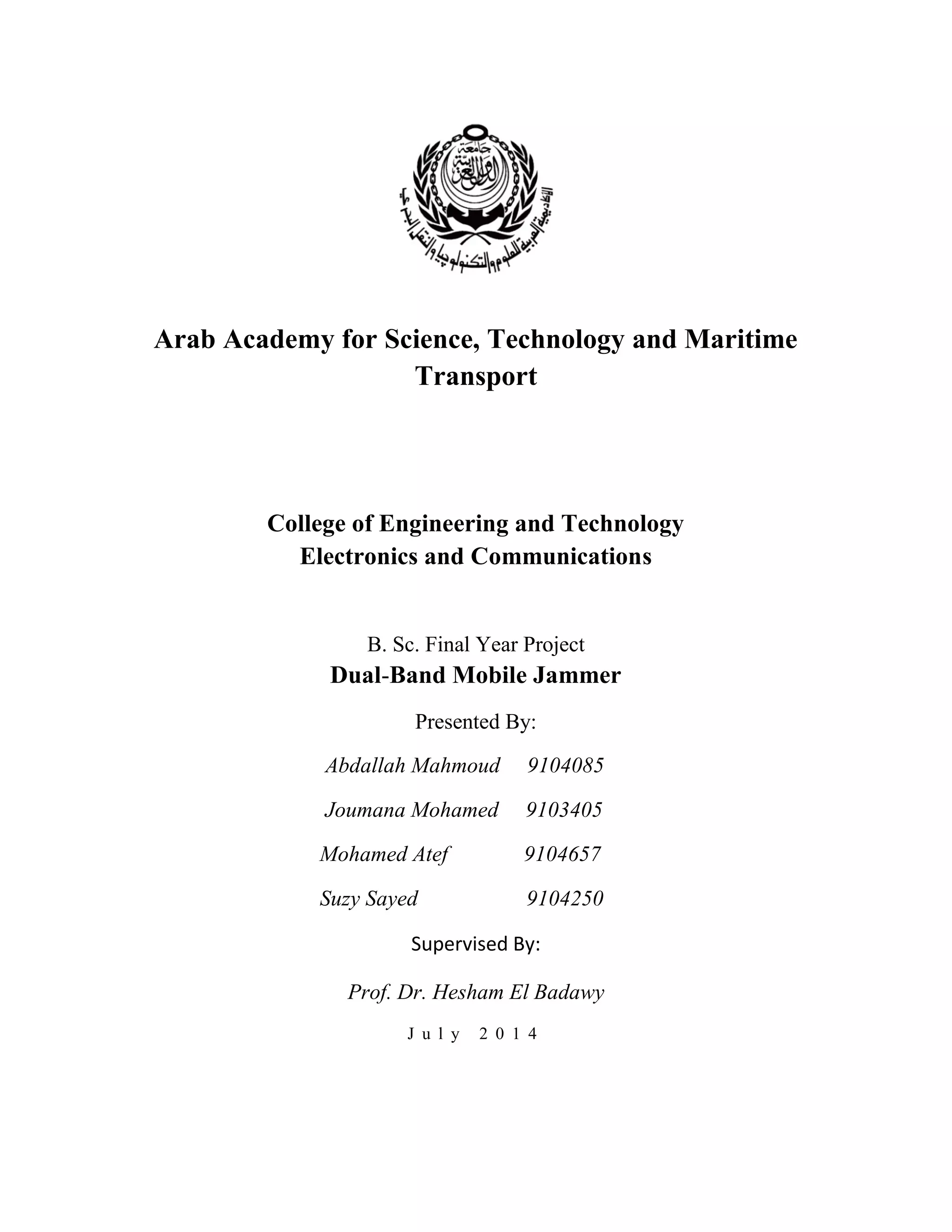 The document outlines a final year project on designing and implementing a dual-band mobile jammer by students from the Arab Academy for Science and Technology. It discusses the necessity of mobile jammers in various settings for maintaining silence, elaborates on the technological specifications, legal considerations, and jamming techniques used. Additionally, it provides insights into the design parameters, experimental results, and future work related to mobile jamming technology.