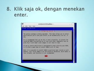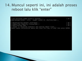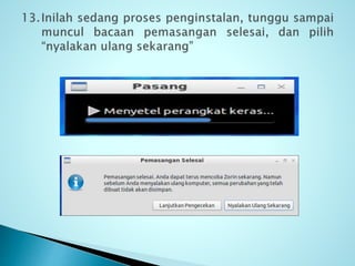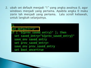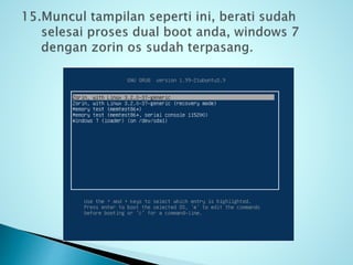 Dual-booting adalah teknik untuk menginstal dan menjalankan dua sistem operasi berbeda pada satu komputer, memungkinkan siswa untuk mengelola partisi, mengubah tampilan login, dan melindungi data yang ada. Kelebihan dari dual-booting termasuk efisiensi sumber daya dan kemudahan akses data antar OS, sementara kekurangannya adalah hanya dapat menjalankan satu OS pada satu waktu dan prosedur instalasi yang rumit. Proses pemasangan juga mencakup langkah-langkah untuk membagi partisi dan mengubah tampilan grub.