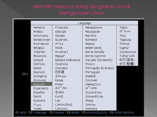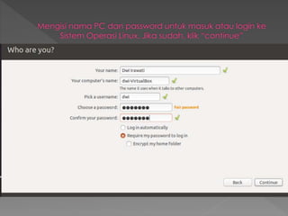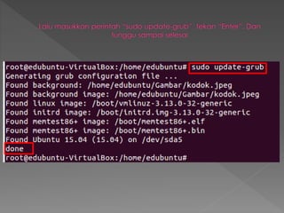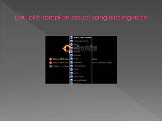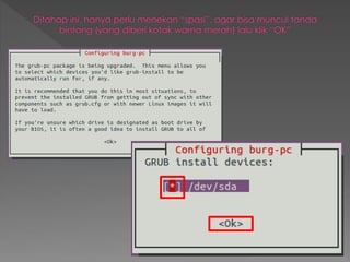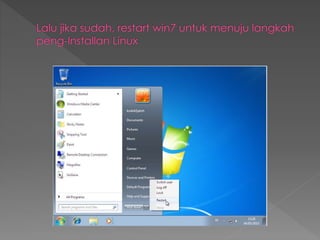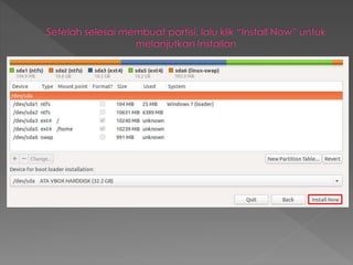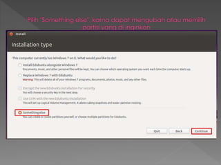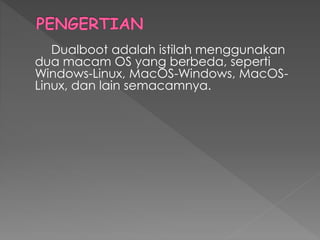 Dokumen ini menjelaskan tentang dualboot antara Windows dan Linux, termasuk pengaturan partisi dan langkah-langkah instalasi. Ada keuntungan dan kerugian dalam dualboot, seperti perlunya ruang disk yang cukup dan risiko ketidakstabilan. Penting untuk menginstal Linux setelah Windows agar boot loader Windows tidak terhapus.