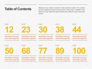 This document provides an overview of slidedoc templates. It explains that slidedocs are visual documents intended to be read instead of projected. The template includes features like a table of contents, typographic hierarchy, sample slides demonstrating layouts, and guidance for adding graphics and charts to help visualize concepts. The goal is to communicate ideas quickly in a format that is easy to navigate.