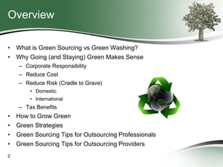 This document discusses how green sourcing can benefit businesses financially and environmentally. It defines green sourcing as purchasing goods and services that minimize environmental impacts and outlines why green outsourcing reduces costs through energy savings, lowers risks from regulations, and provides tax benefits. The document provides tips for both buyers and providers on developing green sourcing programs, asking environmental questions in requests for proposals, and marketing green strengths without greenwashing. It introduces TechNexxus as an outsourcing consulting firm that helps clients with green sourcing strategies.