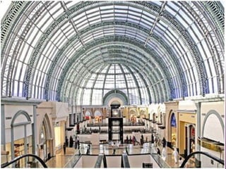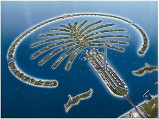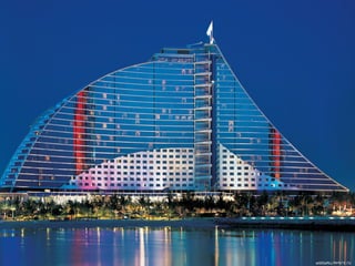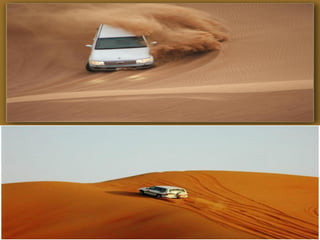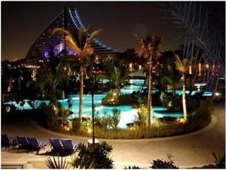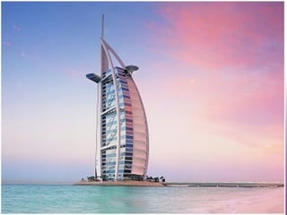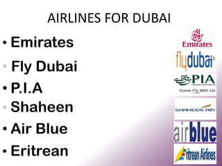 The document provides information about transportation and attractions in Dubai. It describes the major airlines that fly to Dubai, including Emirates, Fly Dubai, and PIA. It also discusses the public bus system, taxis, and metro system for transportation within Dubai. Popular tourist attractions mentioned include the Palm Jumeirah, Burj Al Arab hotel, Jumeirah Beach, Burj Khalifa, Dubai Marina, Gold Souk, Mall of the Emirates, and Wild Wadi water park. Desert safaris, dhow cruises, and yacht charters are also highlighted as activities.