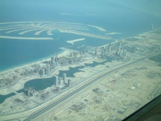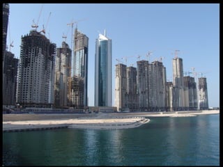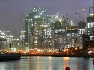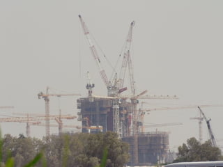 Dubai is experiencing rapid growth, with $90 billion in construction projects currently underway, making it one of the fastest growing cities in the world. 15% of the world's tower cranes are located in Dubai to support projects like the Burj Dubai Tower, which will be the world's tallest building in 2008, and Dubai Land, a theme park featuring life-sized roaming dinosaurs scheduled to open in 2009. Additional major projects include expanding Dubai's airport, the Dubai Marina development, and the artificial island community of Jumeirah Beach Residences.
