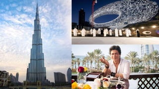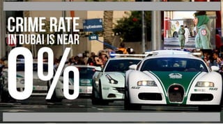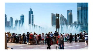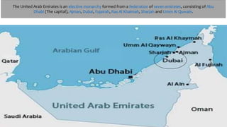 Dubai is one of the seven emirates that make up the United Arab Emirates. It has experienced rapid growth from a small fishing and pearl diving village to a modern metropolis due to its oil discovery in 1966 and development of tourism and real estate. Some of Dubai's most notable landmarks include Burj Khalifa, the tallest building in the world, and the Palm Islands residential and resort developments. Dubai has positioned itself as a business and tourism hub through tax-free zones and its vision to be one of the most visited cities, with future projects continuing its ambitious expansion plans.