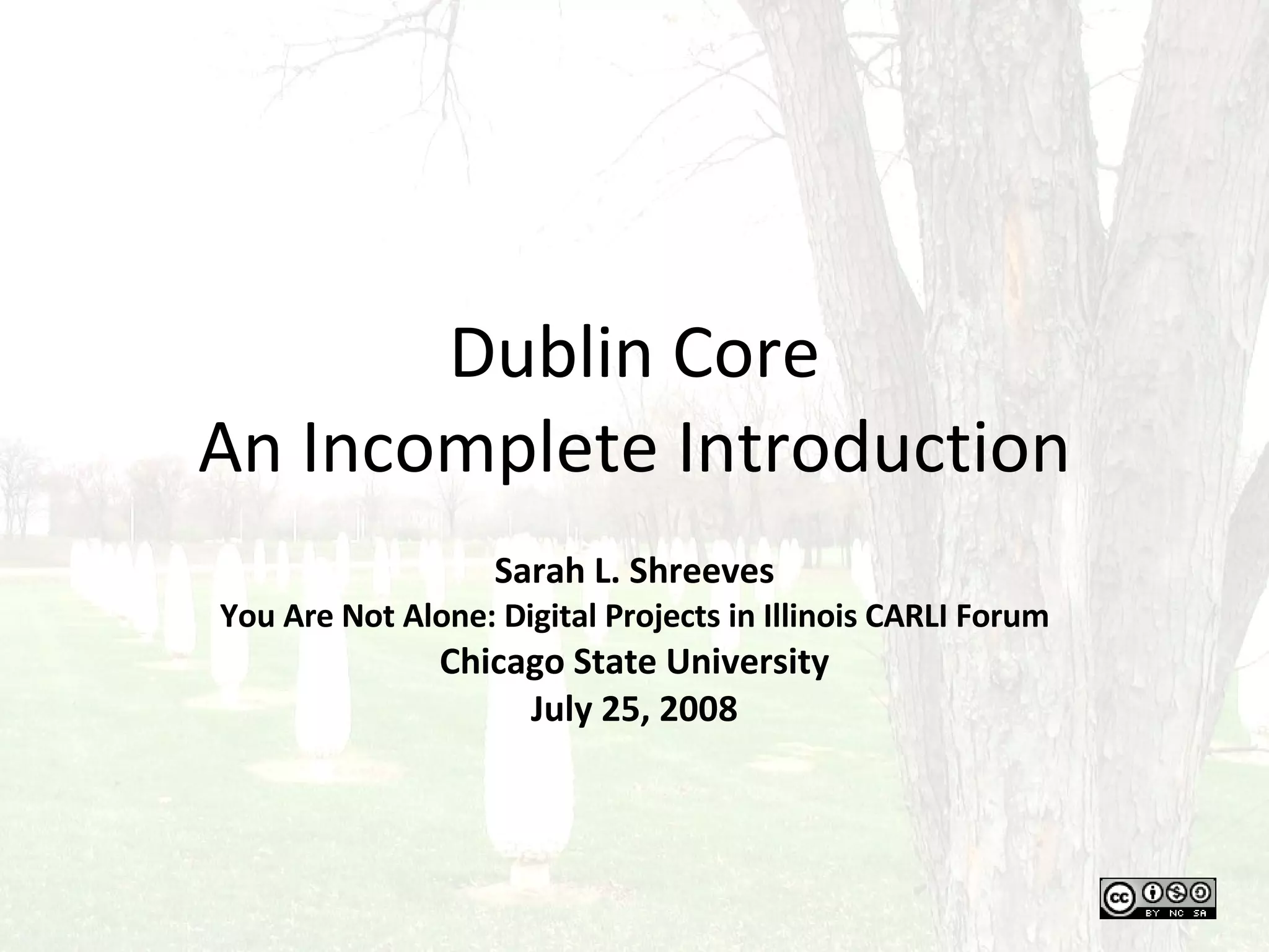 The document provides an incomplete introduction to Dublin Core, a metadata standard for describing and discovering resources on the Internet or in digital collections. It discusses the history and development of Dublin Core, describes the basic Dublin Core elements and their flexibility, and provides examples of Dublin Core metadata records and best practices for their creation. The document also notes potential issues with Dublin Core implementation and ways to address them, as well as the current and future directions of Dublin Core.
