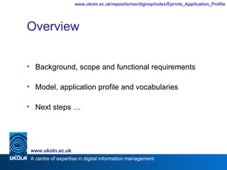 The document summarizes the Dublin Core Application Profile for Scholarly Works (ePrints) which provides a richer metadata profile for describing scholarly works in repositories. It outlines the functional requirements, entity-relationship model based on FRBR, and application profile with properties and vocabularies to capture metadata for scholarly works and related entities like expressions, manifestations, and copies. Next steps include developing an XML schema and gaining community acceptance and adoption of the application profile.