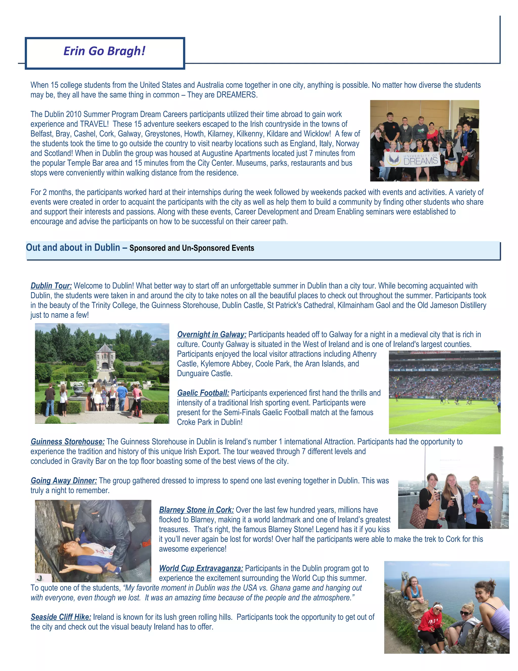 The document summarizes the Dublin Summer Program 2010, which brought together 15 college students from the US and Australia for 2 months of internships, career development activities, and travel around Ireland. Students interned in Dublin during the week and participated in organized and self-guided activities and events on weekends, such as tours of Dublin and other cities, sporting events, trips to museums and landmarks, and music festivals. Employers praised the interns' work and one employer promoted his intern on the radio. Students said the program staff supported them throughout the 8 weeks.