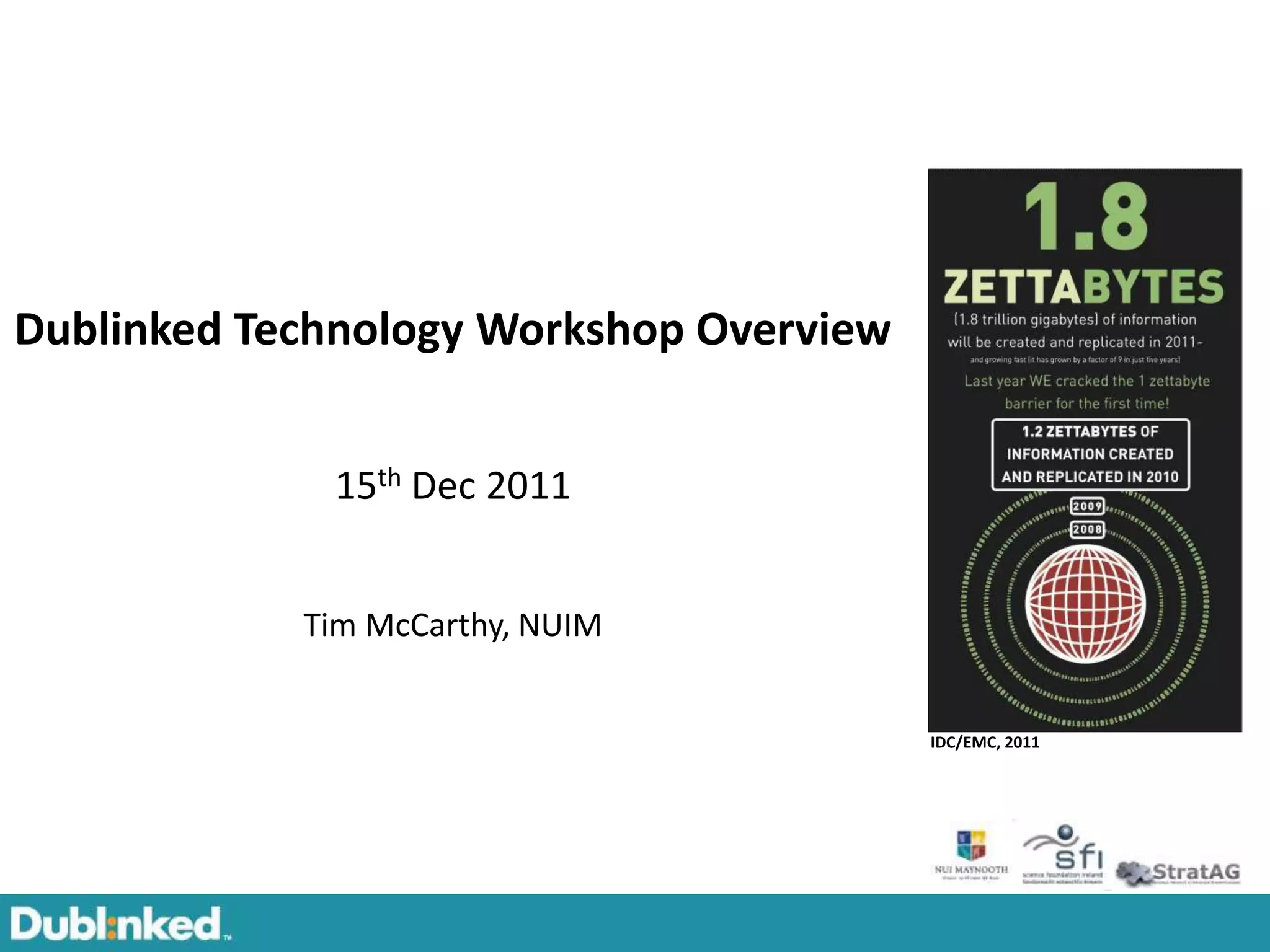 The document provides an overview of the Dublinked Technology Workshop held on December 15th, 2011. It includes presentations on transportation data, spatial web services, linked data, and semantic data description. Breakout sessions covered topics like data publishing, discovery, web services, and advanced functions. The workshop aimed to address challenges around sharing digital data between organizations and discussed technical requirements and tools to support open government data platforms.