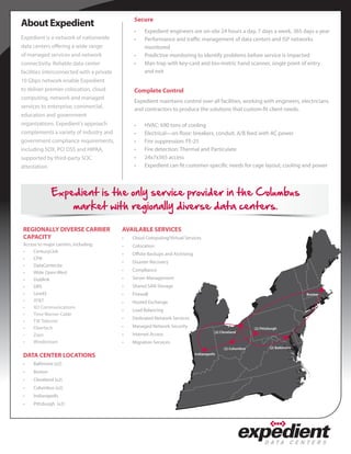 The document describes Expedient's Dublin data center, which has 3 phases totaling 60,000 square feet and 1725 cabinets. Phase 1 has 29,000 square feet and 575 cabinets. The data center has 12 generators providing 18 MW of total power capacity and 2070 tons of cooling. Expedient operates the data center 24/7/365 and provides benefits such as scalable infrastructure and a strategically located, risk-adverse region.
