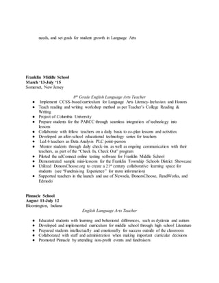 This document is a resume for Jaimie Dubuque, an educator focused on supporting students. She has over 5 years of experience teaching English Language Arts to middle school students. Her experience includes implementing workshop models, data analysis, integrating technology, and presenting at educational conferences. She holds a Bachelor's degree in Secondary English Education and is a member of several professional organizations.