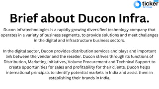 Ducon Infratechnologies is a diversified technology company operating in digital and infrastructure sectors, focusing on distribution services and turnkey projects in India. The company aims to facilitate sales for clients through marketing, volume procurement, and technical support, while also helping international principals establish their brands in the Indian market. Ducon is backed by a team of skilled professionals and emphasizes strong ethical and commercial foundations for sustained growth.
