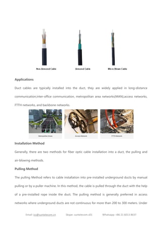Duct cable offers robust protection for fiber optic cables, designed for installation in buried duct systems. It is ideal for applications in long-distance communication networks and can be installed using either pulling or air-blowing methods. Sun Telecom provides a range of duct cable products and solutions, emphasizing their durability and potential for future expansion.