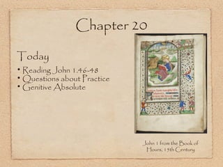 This document summarizes key points about the genitive absolute from a chapter on grammar. It includes examples of the genitive absolute construction from the New Testament involving a noun and participle. The genitive absolute typically occurs at the beginning of a clause and conveys background information. The chapter also briefly discusses periphrastic verb forms, comparisons, and the optative mood.