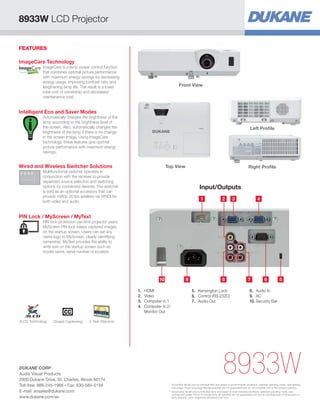 The Dukane 8933W LCD projector is designed for classrooms and conference rooms, offering 3,000 ANSI lumens and WXGA resolution for bright, high-quality images. It features ImageCare technology for energy savings and extended lamp life, as well as security features like pin lock protection. Backed by a generous warranty, this projector is a cost-effective solution with options for wired and wireless connectivity.
