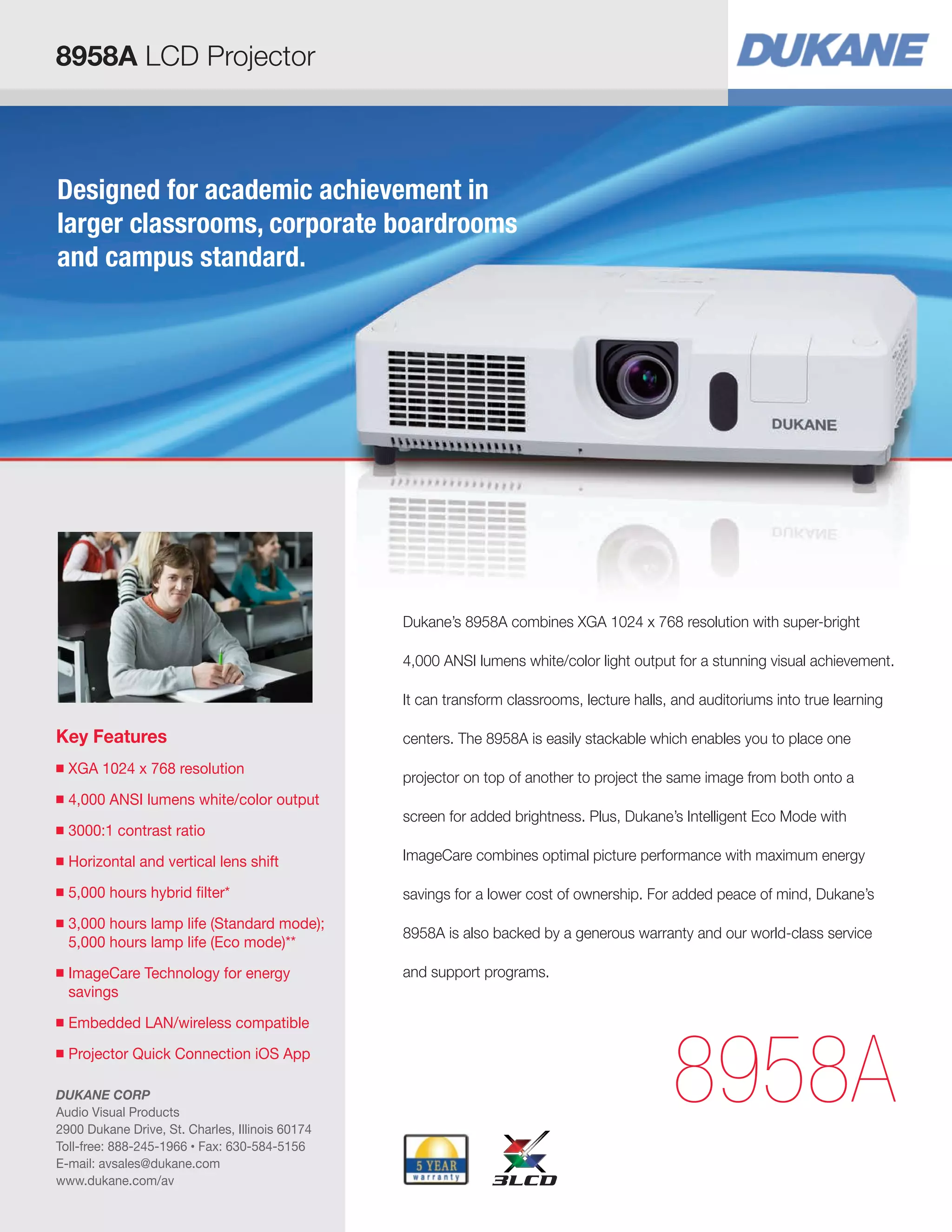 The Dukane 8958A LCD projector has XGA 1024 x 768 resolution and 4,000 ANSI lumens brightness. It features horizontal and vertical lens shift, a 3000:1 contrast ratio, and lamp lives of 3,000 hours in standard mode and 5,000 hours in eco mode. The projector is designed for use in classrooms, lecture halls, and auditoriums to enhance the learning experience.