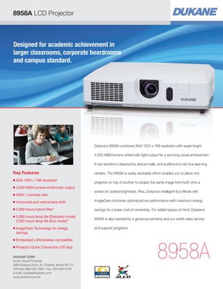 The Dukane 8958A LCD projector offers 4,000 ANSI lumens brightness and XGA 1024 x 768 resolution, making it ideal for academic and corporate environments. It features energy-saving technologies, a long lamp life, easy maintenance options, and support for wireless connectivity, enhancing presentation capabilities. With additional features like USB cloning, PC-less presentations, and advanced image correction, this projector is designed for optimal performance and user convenience.