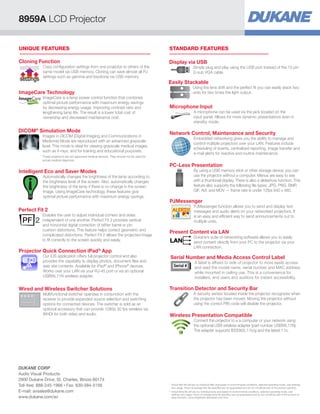 The Dukane 8959A LCD projector has XGA 1024 x 768 resolution and 5,000 ANSI lumens brightness. It features horizontal and vertical lens shift, a 3000:1 contrast ratio, and lamp lives of 3,000 hours in standard mode and 5,000 hours in eco mode. The projector is designed for use in classrooms, lecture halls, and auditoriums to enhance the learning experience.