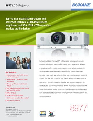 The Dukane 8977 LCD projector offers 7,000 ANSI lumens brightness and XGA 1024 x 768 resolution, designed for mid to large venues with advanced features such as motorized control, multiple lens options, and DICOM simulation mode for grayscale medical images. It includes networking capabilities for managing multiple devices, real-time status monitoring, wireless presentation options, and a variety of input sources for enhanced versatility. Built with a durable magnesium body and backed by a generous warranty, the 8977 is user-friendly, making it ideal for various presentation applications.