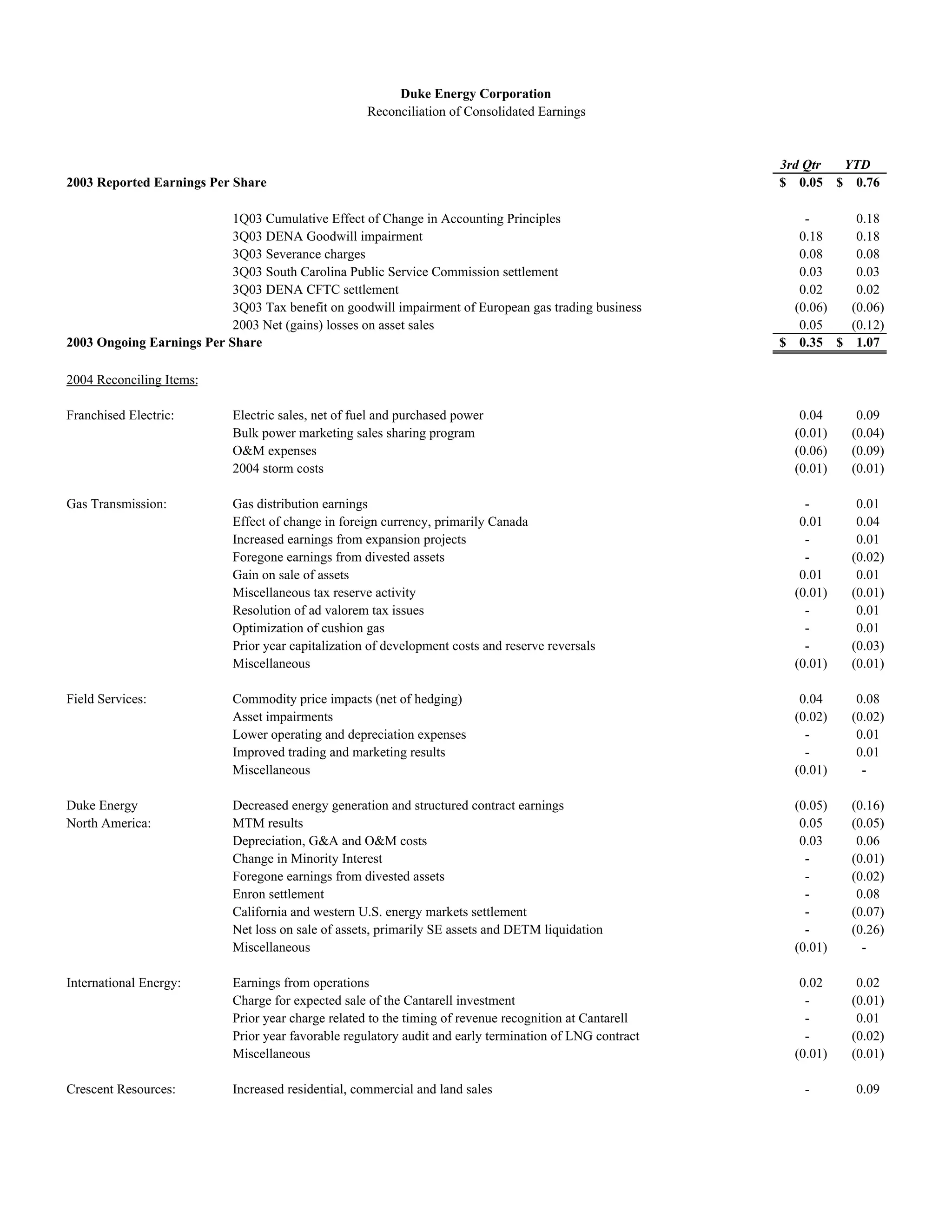 Duke Energy provided a reconciliation of reported earnings per share for the third quarter and year-to-date 2003 and 2004. Several one-time gains and losses were identified for both years, including asset sales, impairments, settlements and tax adjustments. Excluding these one-time items, ongoing earnings per share were $0.35 for the third quarter of 2003 and $1.07 year-to-date, compared to $0.38 for the third quarter of 2004 and $1.15 year-to-date. The reconciliation identified various factors across Duke Energy's business segments that impacted reported results.