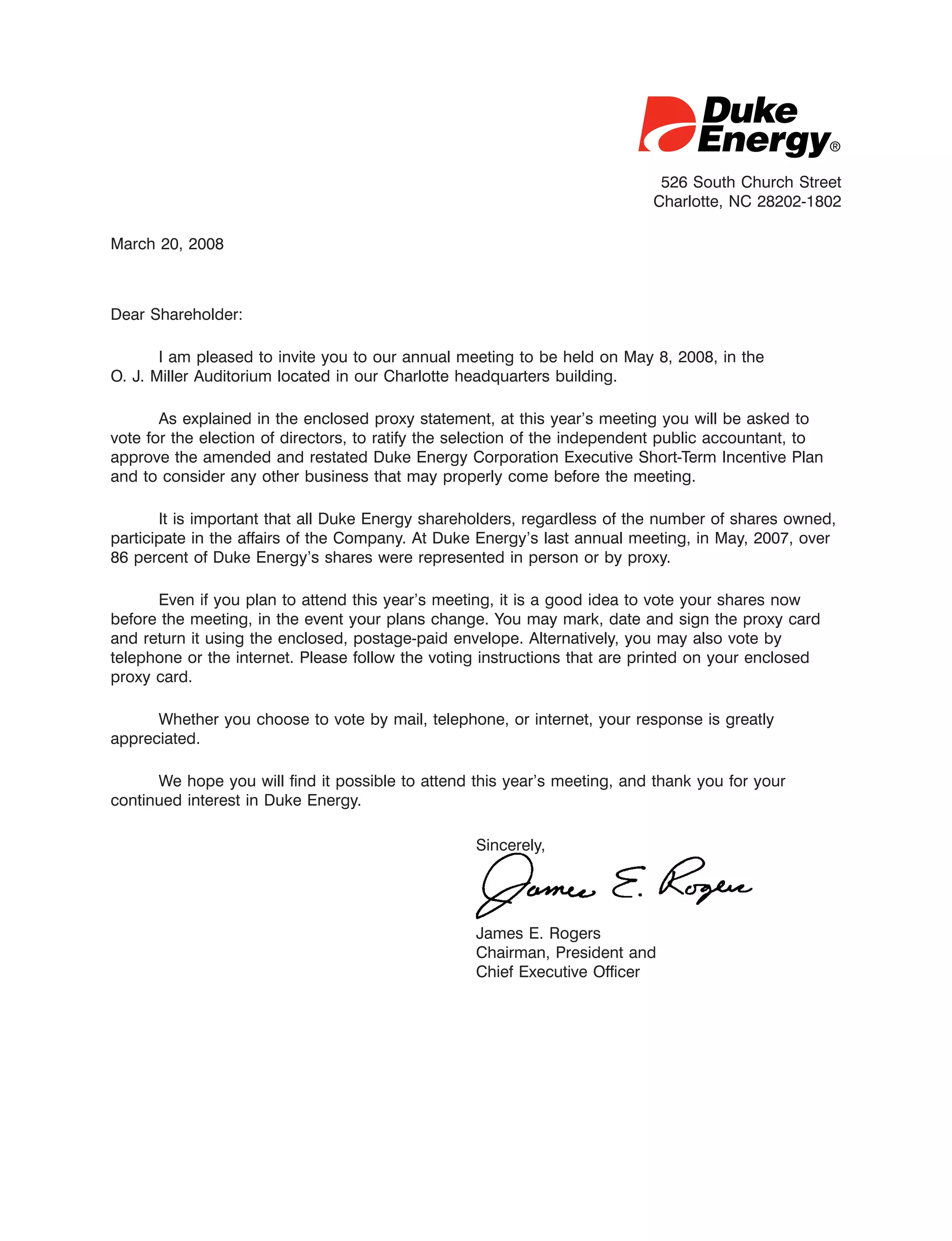 - The document is a proxy statement from Duke Energy Corporation announcing their annual shareholder meeting on May 8, 2008. - Shareholders will vote on electing directors, ratifying Deloitte & Touche LLP as the independent auditor, and approving an amended executive compensation plan. - 11 candidates are up for election to Duke Energy's Board of Directors. Brief biographies of each candidate are provided.