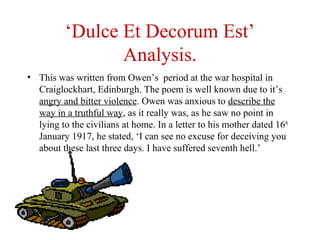 Owen's poem "Dulce Et Decorum Est" describes the wretched conditions of soldiers during World War I. In the first stanza, the men are bent over like beggars, coughing and cursing as they struggle through deep mud, exhausted from battle. In the second stanza, a gas attack occurs and one soldier struggles to put on his mask in time, choking and drowning in front of the other men. Years later, the speaker still has nightmares of watching the dying soldier. The poem ends by critiquing the saying "It is sweet and right to die for your country" as a lie, highlighting the horrific reality of war that is far from glorious patriotic tales.