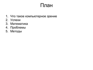 Доклад рассматривает современное состояние и основные методы компьютерного зрения, включая классификацию задач, успехи и существующие проблемы. Обсуждаются методы извлечения и анализа цветовых и геометрических структур, а также проблемы, связанные с комбинаторным взрывом и сегментацией изображений. Представлены обзорные ретроспективы развития методов компьютерного зрения с акцентом на ключевых алгоритмах и их применениях.