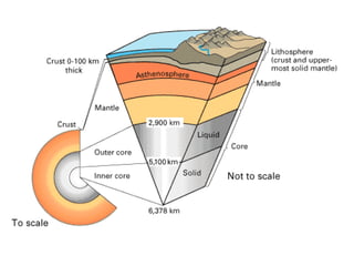 The Earth is not a perfect sphere, but is slightly flattened at the poles and bulging at the equator. It has multiple interior layers, including a crust, mantle, and core. The crust and upper mantle make up the lithosphere, which overlies the asthenosphere and mesosphere in the mantle. The core is divided into a solid inner core surrounded by a liquid outer core. Seismic waves have revealed details of the Earth's internal structure.