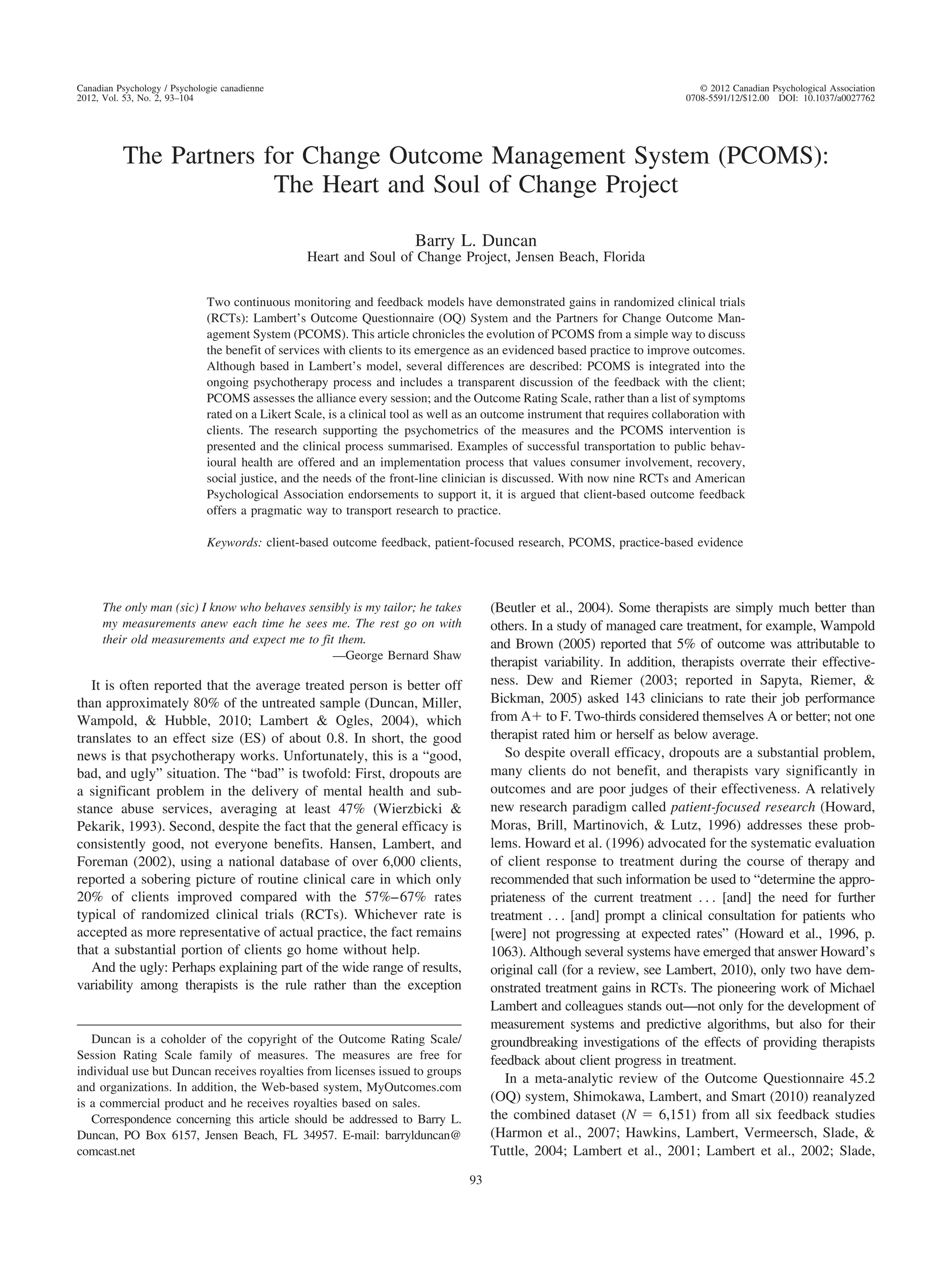 The article discusses the development and research supporting the Partners for Change Outcome Management System (PCOMS). PCOMS uses two brief measures - the Outcome Rating Scale (ORS) and Session Rating Scale (SRS) - to collect feedback from clients at each session on their progress and the therapeutic alliance. The ORS and SRS were developed to be brief and feasible for routine use. Research shows providing therapists feedback based on these measures improves client outcomes compared to treatment as usual. The article outlines how PCOMS was developed and refined, presents supporting research on the measures' psychometrics and clinical usefulness, and discusses examples of implementing PCOMS in behavioral health settings.