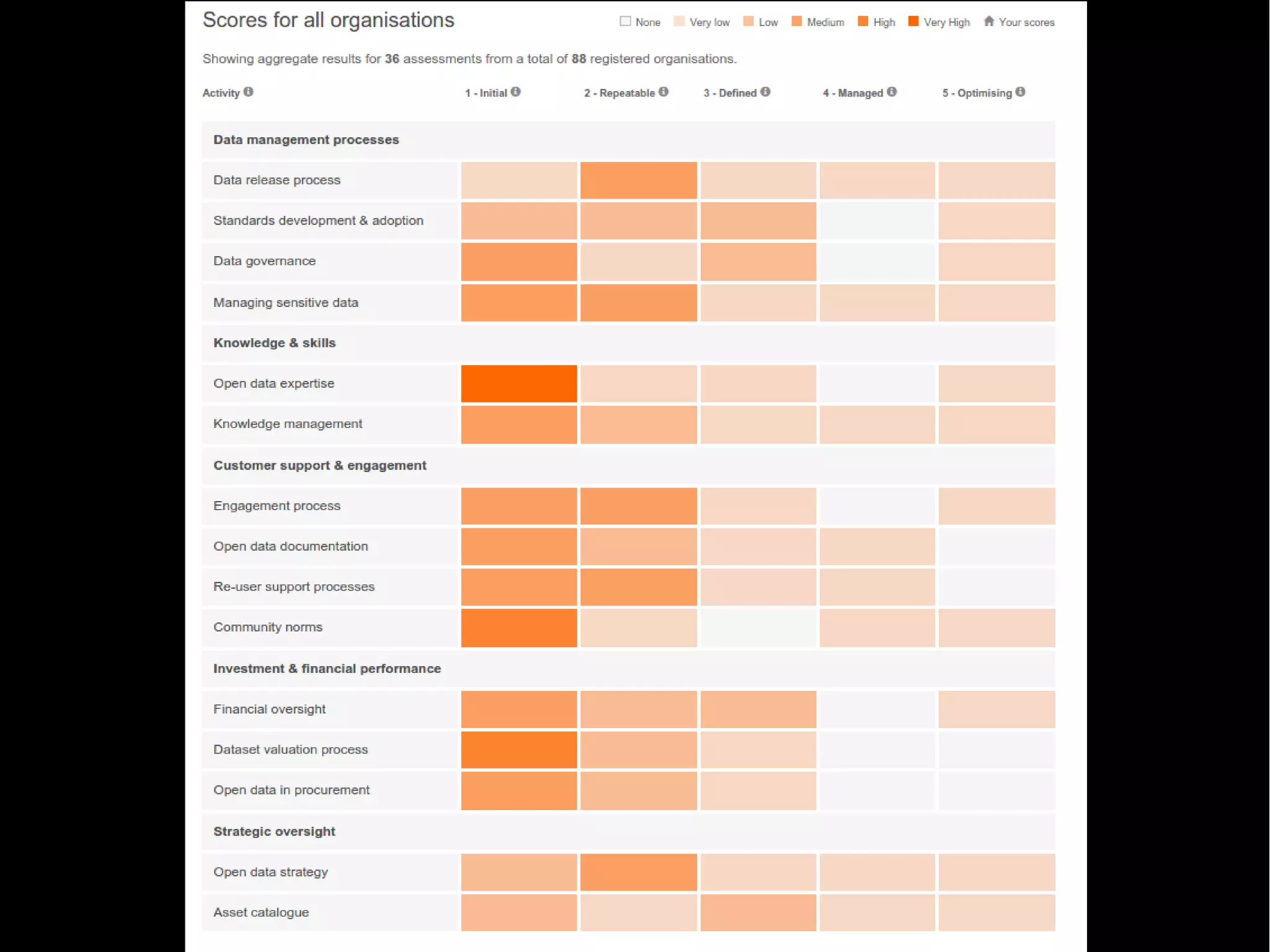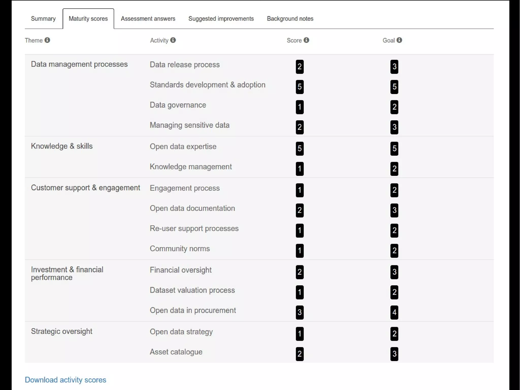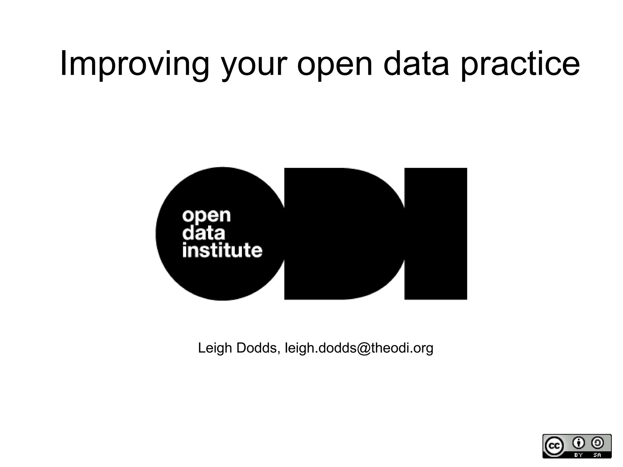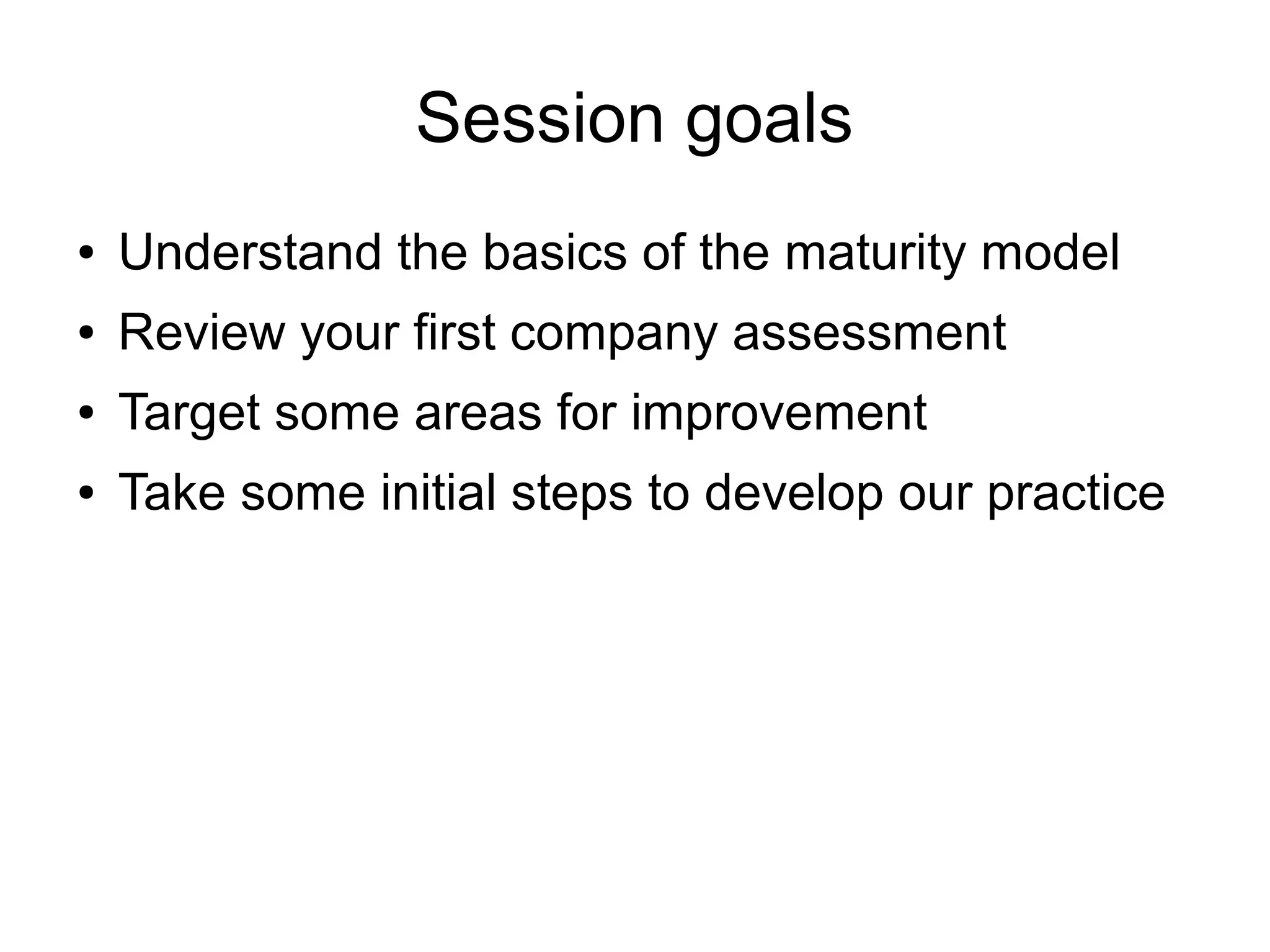 This document outlines steps to improve an organization's open data practice using a maturity model assessment. It discusses understanding the basics of the maturity model, reviewing an initial company assessment, targeting areas for improvement, and taking initial steps to develop the open data practice. Specific activities include identifying key metadata for internal datasets, filling out a draft asset catalogue, planning a data release process, prioritizing existing published data for curation, and rolling out improvements to other teams. The overall goal is for the organization to become more efficient at delivering data to customers.
