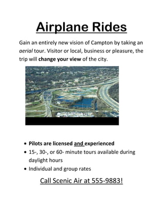 Scenic Air offers airplane rides over Campton to give customers a new perspective of the city from above. Licensed and experienced pilots provide tours that last 15, 30, or 60 minutes during daylight hours for individual and group rates. Interested parties can contact Scenic Air at 555-9883 to book an aerial tour of Campton.